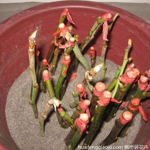 插條的剪。先取當年生粗壯枝條以中部為佳。每個插條保留3~4芽,插條長10~15厘米。剪截時,上剪口距芽1~1.5厘米平剪,下剪口在側(cè)芽基部的痕處平剪。剪口要平滑,剪后將插條立即用ABT溶液浸泡處理,再用腐霉利或高錳酸鉀噴霧處理插條和沙子,然后進行低溫保貯。