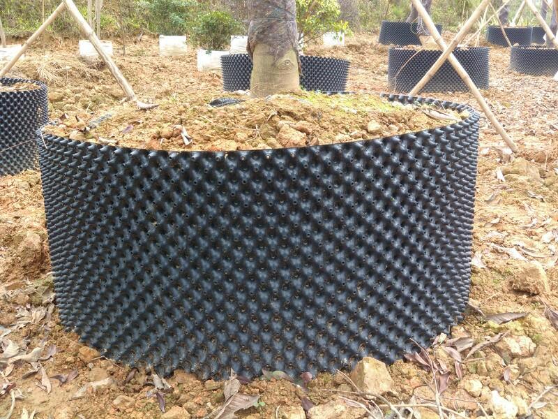 聚乙烯材料制作,由側(cè)壁、插桿(或螺栓)和底盤3個(gè)部件組成。使用時(shí)將各部件組裝起來(lái)即可,在大規(guī)格苗木生產(chǎn)實(shí)踐中,一般情況下不使用底盤。底盤為篩狀構(gòu)造,獨(dú)特的設(shè)計(jì)形式對(duì)防止根腐病和主根的盤繞有獨(dú)特的功能。側(cè)壁為凹凸相間狀,外側(cè)頂端有小孔。當(dāng)苗木根系向外生長(zhǎng)時(shí),由于“空氣修剪”作用,促使根尖后部萌發(fā)更多新根繼續(xù)向外向下生長(zhǎng),極大地增加了側(cè)根數(shù)量。